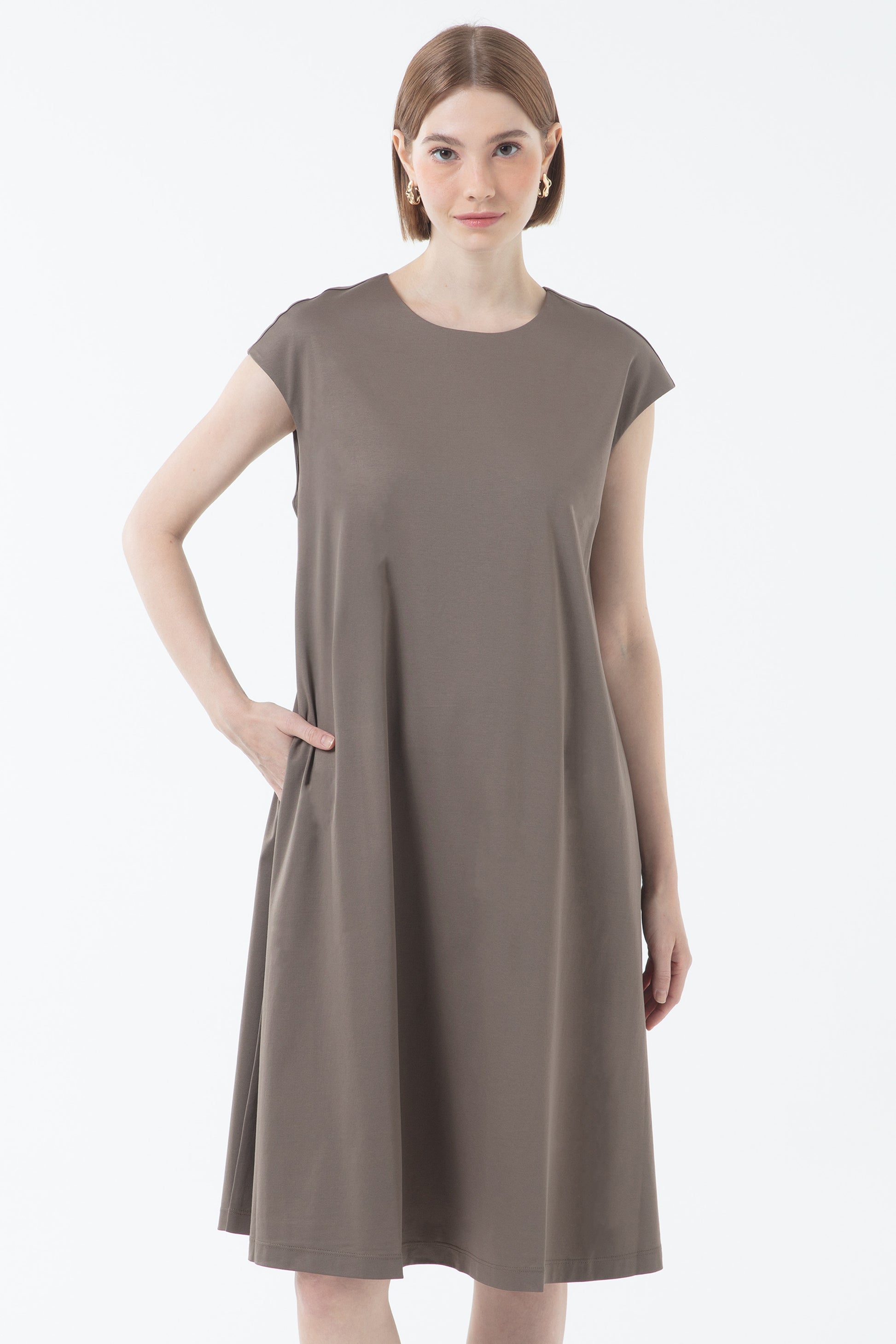 -Loose Fit-Round Neckline-Cap Sleeve-Midi Length-Side Pockets